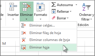 También puede seleccionar la hoja y, después, seleccionar Inicio > Eliminar > Eliminar hoja.